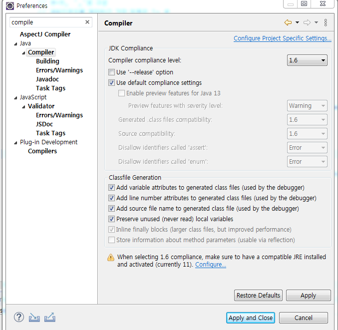 (아래 사진 처럼 굳이 JDK1.6이 아니더라도, 보다 상위버전에서 JDK Compilance를 1.6으로 바꿔줄 수 있다.)