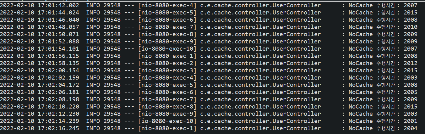logger.info("NoCache 수행시간 : " + Long.toString(end - start));