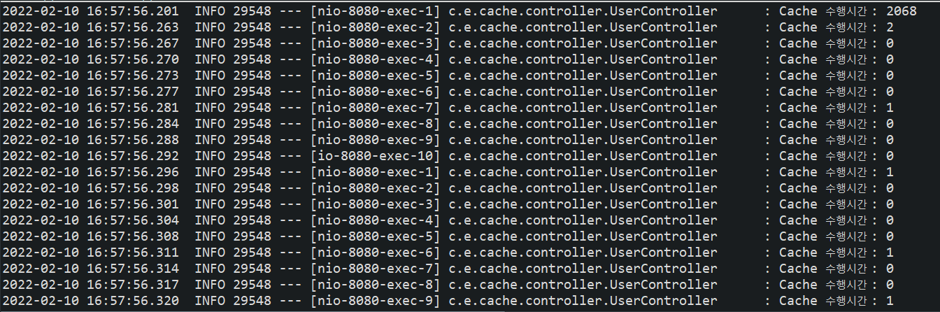 logger.info("Cache 수행시간 : " + Long.toString(end - start));