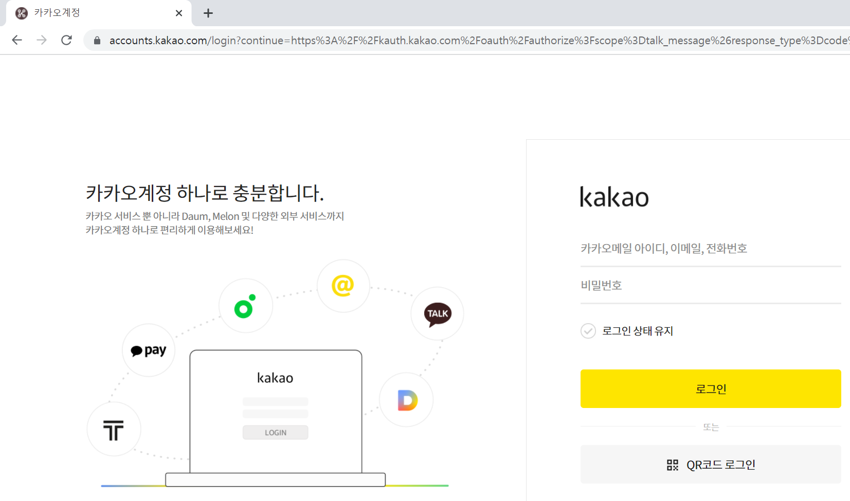 먼저 카카오 인가코드를 받고 엑세스 토큰을 받기위해 브라우저를 통해 해당 URL 에 접근해서 로그인을 해보자.