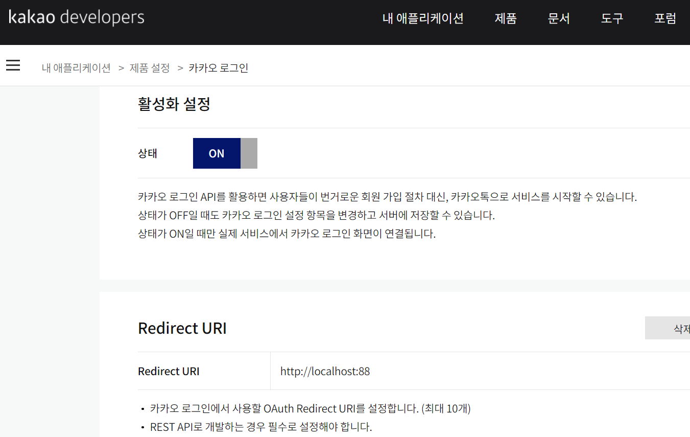 코드를 작업하기에 앞서, 로그인 후 카카오 API에서 return해주는 인가코드 값을 받아줄 서버의 IP, PORT를 입력해준다. 내 애플리케이션 > 제품 설정 > 카카오 로그인을 들어가면 등록해줄 수 있다. 본인의 경우 local에서 88번 port로 인가코드 값을 받을 것이다. 즉, http://localhost:88 을 controller로 작성하여 kakao API에서 Return 해주는 code값을 받을 예정이다.