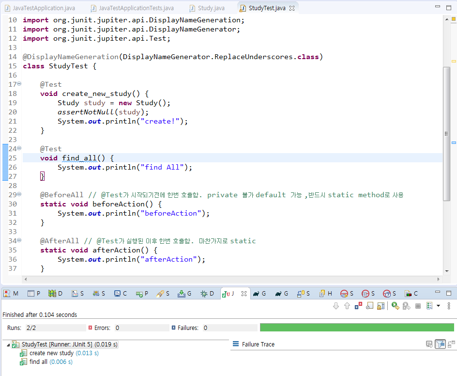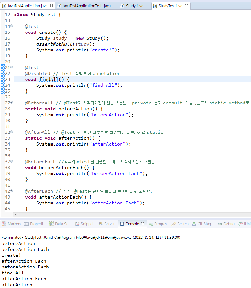 - @BeforeAll : @Test가 시작되기전에 한번 호출. private 불가 default 가능 ,반드시 static method로 사용