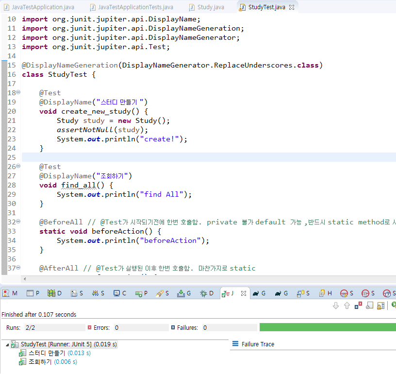 - @AfterAll : @Test가 실행된 이후 한번 호출함. 마찬가지로 static