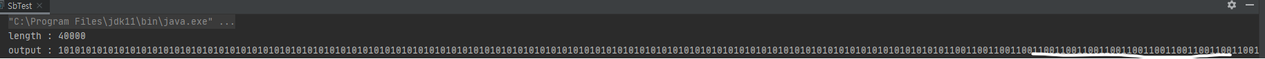 그런데 StringBuffer 에서도 총 삽입되어야 하는 문자의 길이는 맞지만, 11 이나 00 같은 연속되는 문자열의 확인을 통해, Thread 순서대로 값이 들어가는게 아닌 걸 확인했다.
