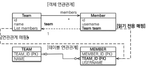 그렇다고 1:N구조의 양방향 매핑이 불가능한 것은 아니다. 강제로 읽기전용 필드를 사용해서 양방향 처럼 사용할 수 있다.
