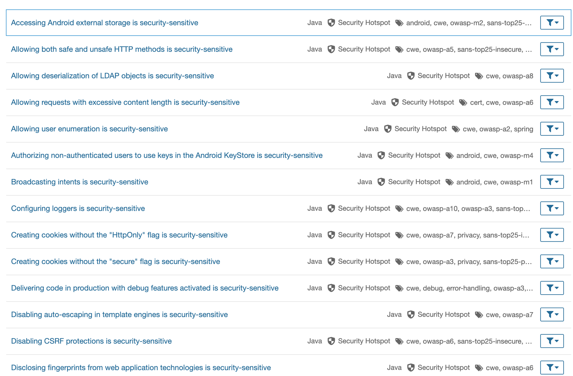 Hard-coded passwords, Hard-coded secrets, 암호화되지 않은 연결 등 개발자가 검토해야 하는 보안에 민감한 코드를 검사하며, SonarQube에서 기본적으로 Java에 대한 보안 핫스팟에 대한 규칙은 37개를 가지고 있다.