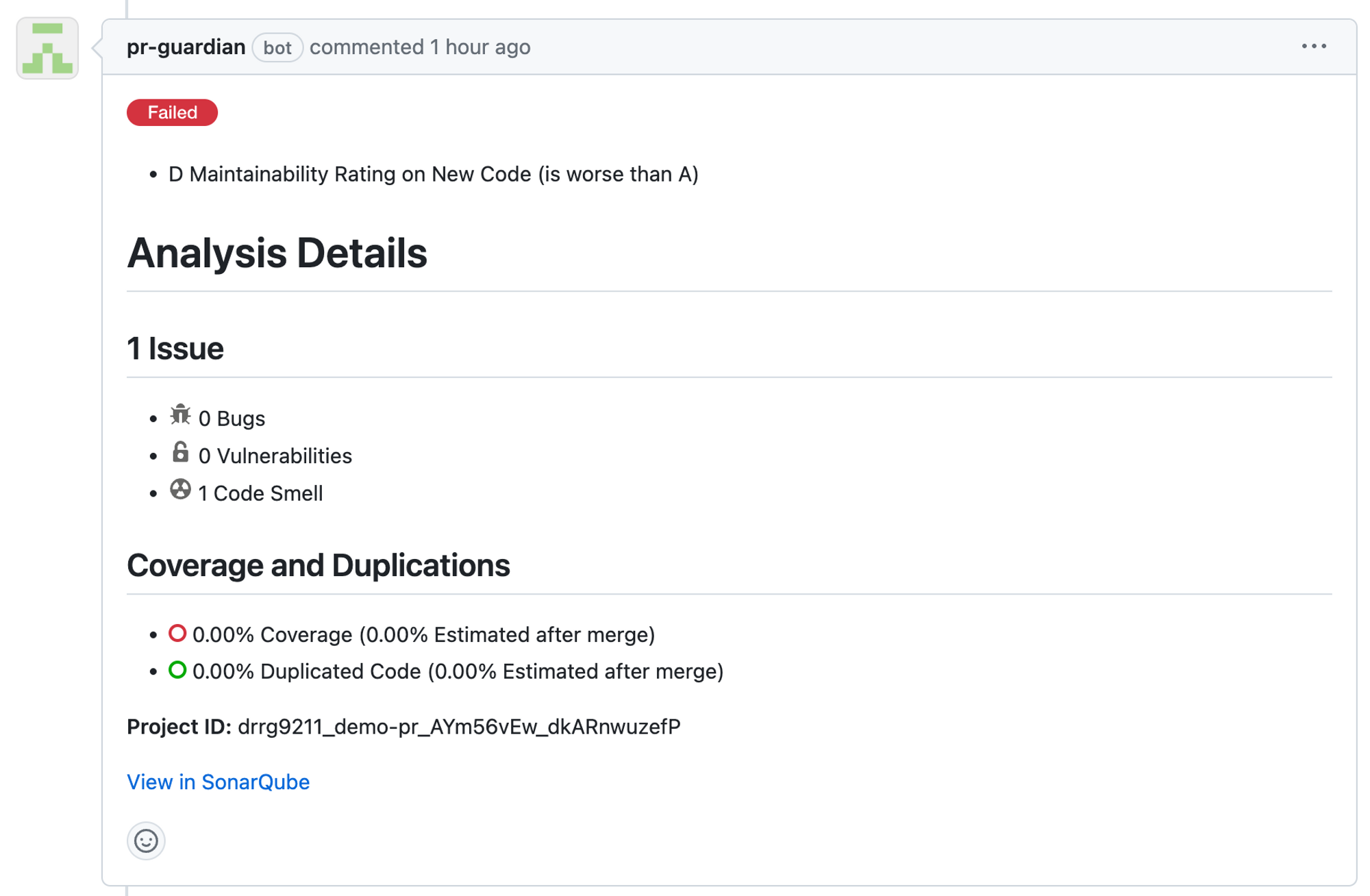 PR decoration이란, Github에 PR을 요청했을 때 SonarQube를 통해 코드를 정적분석 한 후 PR의 Comment에 정적분석 결과와 리포트 링크를 남겨주는 기능이다. Github을 사용할 경우 SonarQube에서 사전연동을 해놓고 Github Actions를 통해 구현이 가능하다. 이 부분이 가장 매력적으로 보였다. 구현하는 방법은 별도의 포스팅을 할 예정이다..!